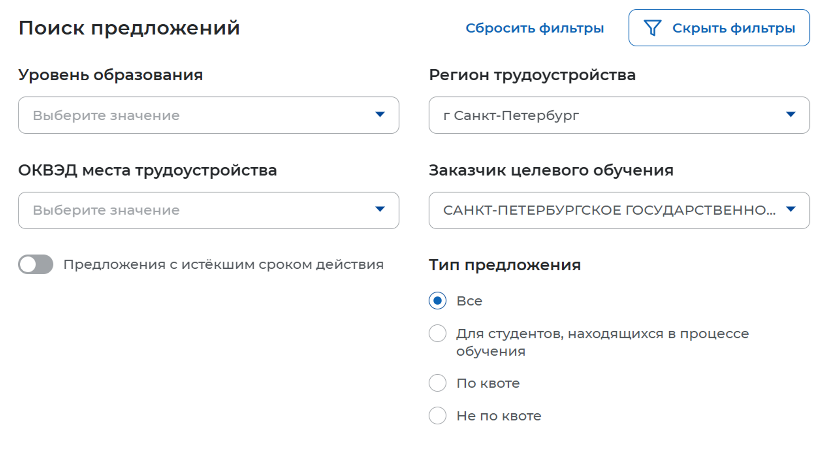 Выбрав СПб ГБУЗ Городскую поликлинику 56 в графе "Заказчик целевого обучения" расширенного фильтра предложений ЕЦП "Работа в России", вы можете увидеть актуальные запросы нашего лечебного учреждения.